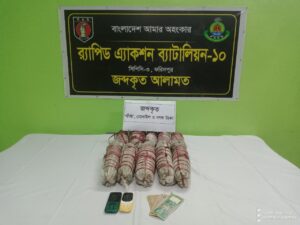 র্যাবের দাবি ঢাকা থেকে আসা একটি বাসের দুই যাত্রী পায়ের কাছে থাকা ট্রাভেল ব্যাগ থেকে ১৫৫,২৫০/- (এক লক্ষ পঞ্চান্ন হাজার দুইশত পঞ্চাশ) টাকা মূল্যমানের ৫ কেজি ১৭৫ গ্রাম গাঁজা উদ্ধার করেন তারা।